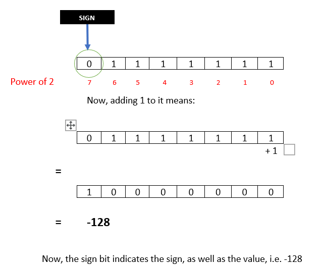 Here, variable c can store values from -128 to +127, but if a value entered is greater than 127 then it will again go back to -128. It just acts like a loop. If we have a char variable x and x contains (ASCII) value 127. and the operation carried out by us is x++, then that means we are adding 1 to 127, but the limit is 127 itself, then it will go to the beginning i.e. -128. Let us understand by Binary value. The Binary value of 127 is 01111111.